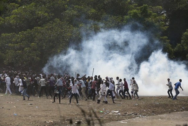 Several people were killed in a stampede near the Ethiopian capital on October 2, according to an AFP photographer at the scene. Several thousand people from the Oromo community gathered at a sacred lake for a religious festival and started to cross their wrists above their heads, a symbol of Oromo anti-government protests. The event quickly degenerated, with protesters throwing stones and bottles and security forces responding with baton charges and tear gas grenades. Together, Oromos and Amharas make up 60 percent of the population and have become increasingly vocal in rejecting what they see as the disproportionate power wielded by the northern Tigrean minority in government and the security forces. / AFP PHOTO / Zacharias ABUBEKER